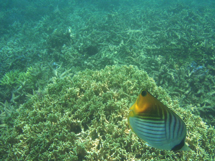 最近のニュース報道などで、ケラマ諸島の珊瑚も、かなりの数、減って来ていると聞いてたので、大分、沖の方まで泳がないと、見えないんだろーなーっと、思っていました。