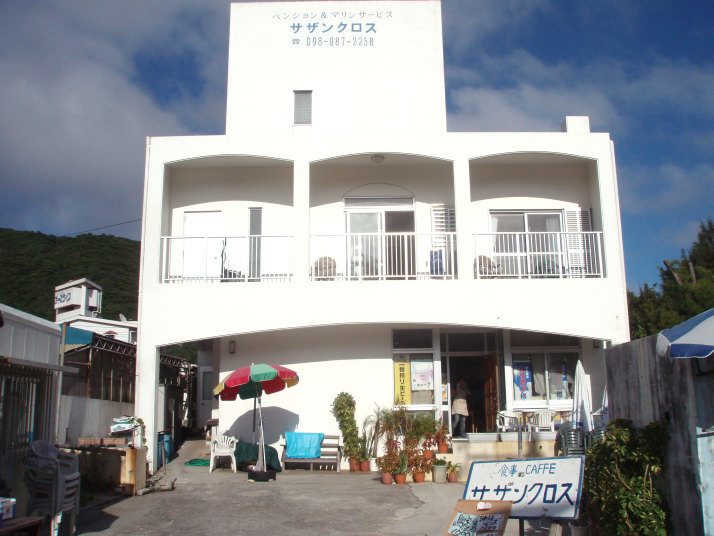 宿に入ろうとした時、玄関前の写真のパラソルの下で、宿のおじさん夫婦+数人が飲んでいて、私達も呼び止められました。