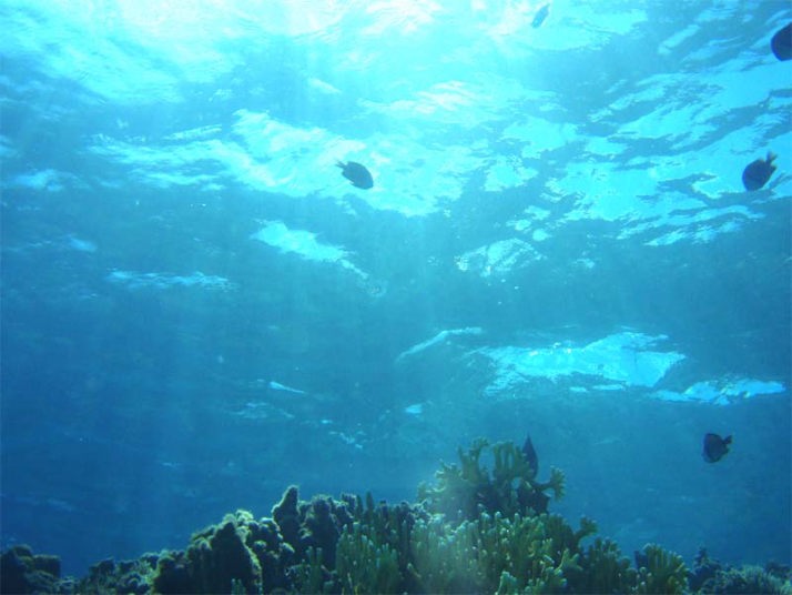 また、いつものように写真をバシバシと撮っているうちに、潜って下からサンゴ礁ナメの水面写真を撮って見たくなり、やって見ました。