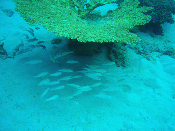 ちょっと深い所に有る珊瑚の下に魚達が隠れているのが見えたので、ガンバって潜って写真を撮って来ました。
