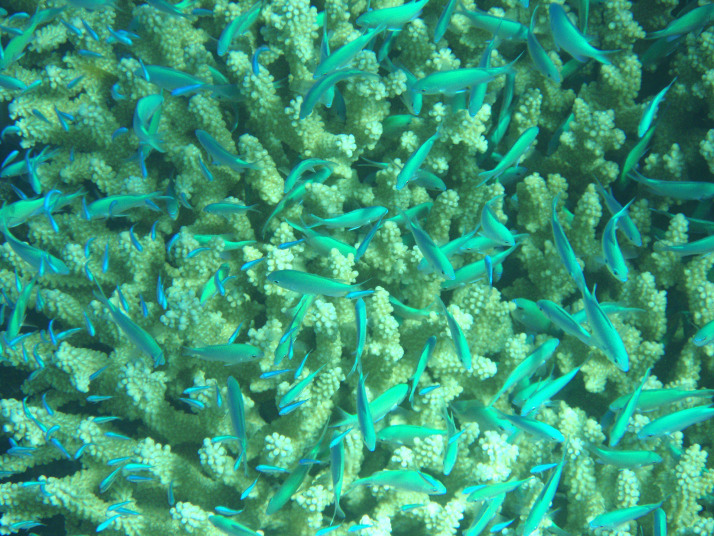 小さな魚達は珊瑚の中に隠れていて、外敵がいない時は花粉のような状態で珊瑚の周りを泳ぎ廻っているんですが、ちょっと大き目の魚が近づいて来ると、さっと一瞬で珊瑚の中に隠れていました。