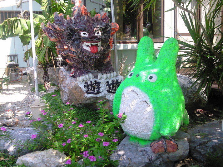 これは、島で一番大きな売店「105ストアー」の前に飾ってあったシーサー達です。