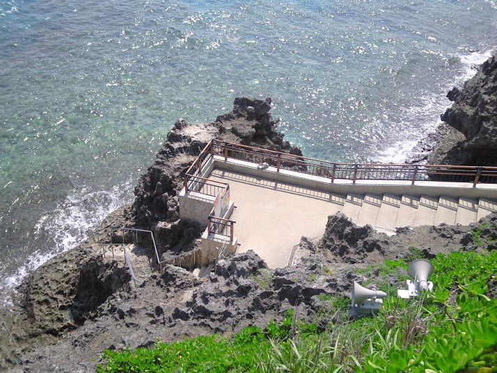 海の方を覗き込むと多少の波は有ったんですが、大丈夫かな〜っと思っていたら、よく見ると階段の下の方にロープがぐるぐる巻きに巻いて有るのが見えました。