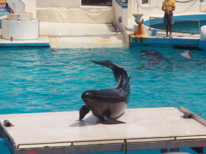 私達は、ショーが終わった後も最後までじっと座って、イルカの調教を眺めていました。