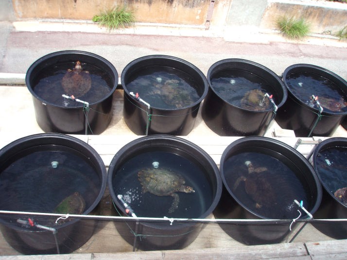 最後に、ふと壁の外を覗いてみると、タライの中に1匹づつ海亀が入れられて並んでいました。
