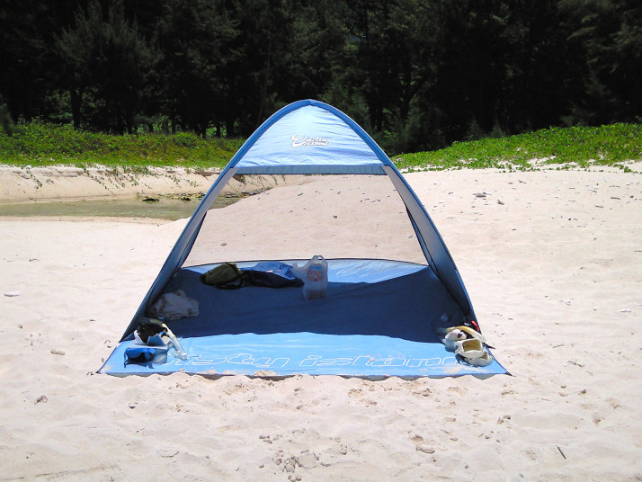 今日は、レンタルのパラソルが結構設置されていたので、空いているビーチの奥の方へ行き、マイテントをセッティングしました。