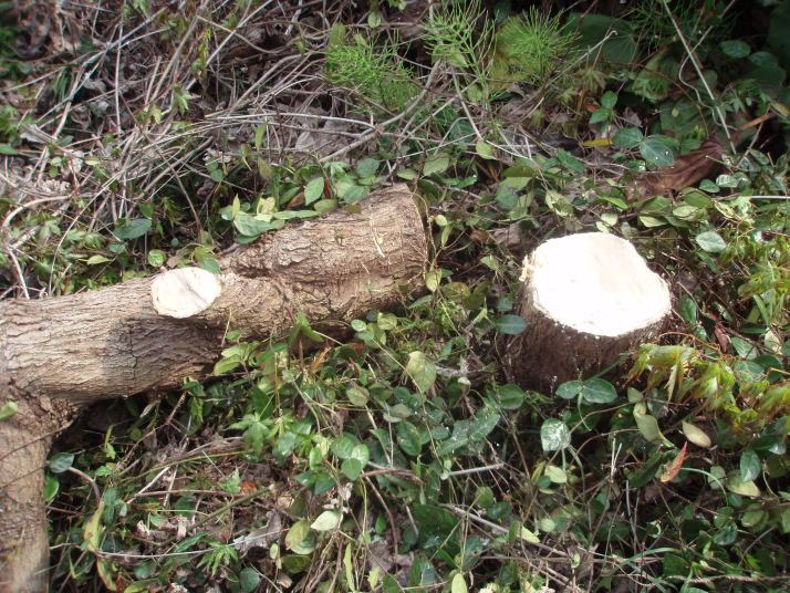 午後は、また家に戻って朝 不動産屋さんが「庭の正面に有る木は切った方が良いですねー。」と言っていたので、のこぎりで頑張って切ってみたんですが、なかなか切り倒す事が出来ず、約半分位のところまで切り進んで行くと腰が痛くなり断念しました。