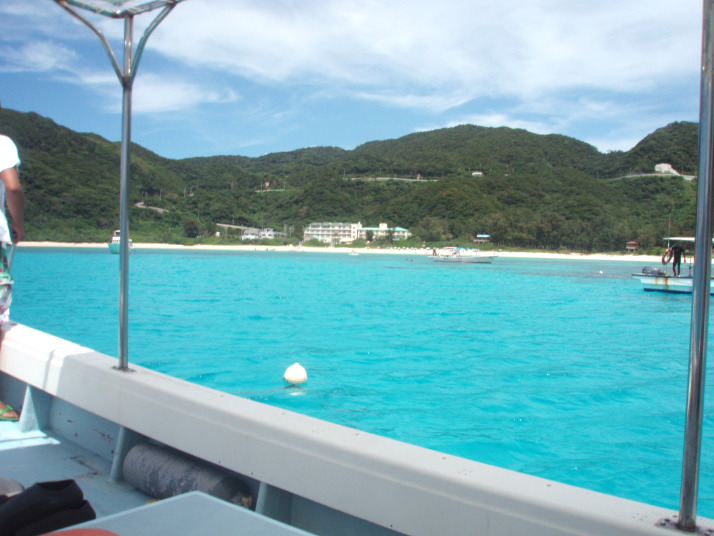 港を出て約10分位で、ダイビングポイントの「渡嘉志久ビーチ」沖に到着しました。
