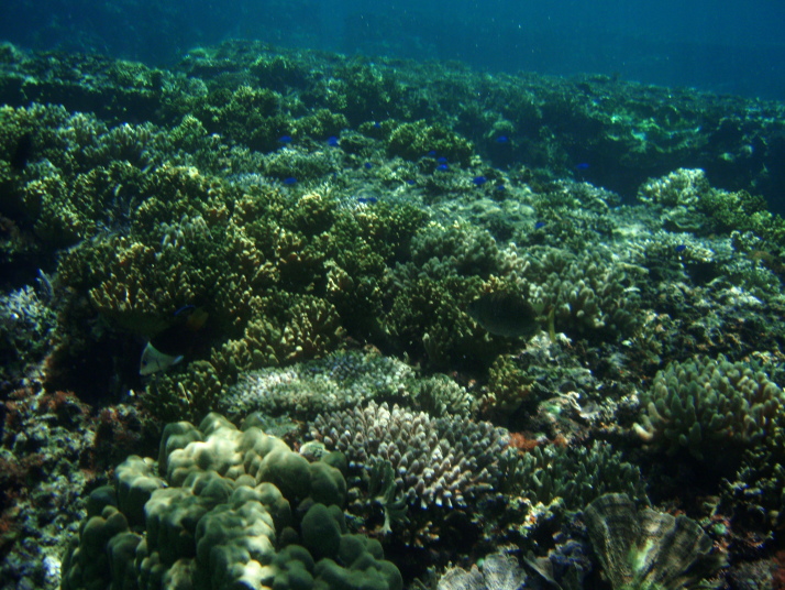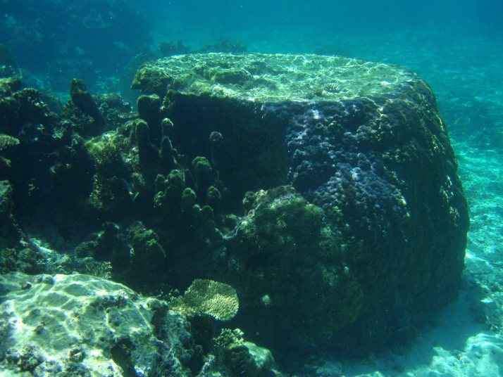 これもこのビーチの特徴なんですが、海底から1m位の高さで珊瑚が丸太をチェーンソーで切ったような形ですべて切れていました。