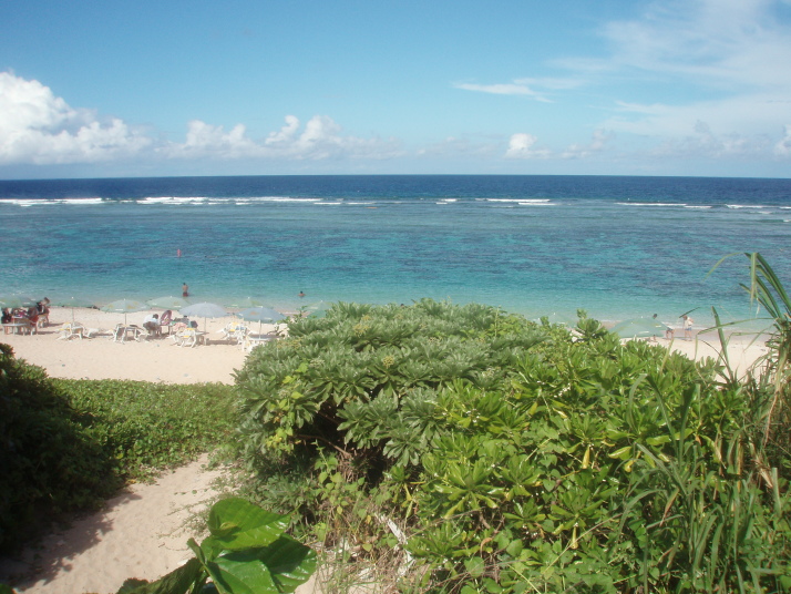 このビーチは不思議な形をしていて、満潮近くでも海岸手前の方で水深2m位の深さで、沖へ行く程浅くなり、最終的にはリーフのところで珊瑚が盛り上がって堤防のようになっていました。