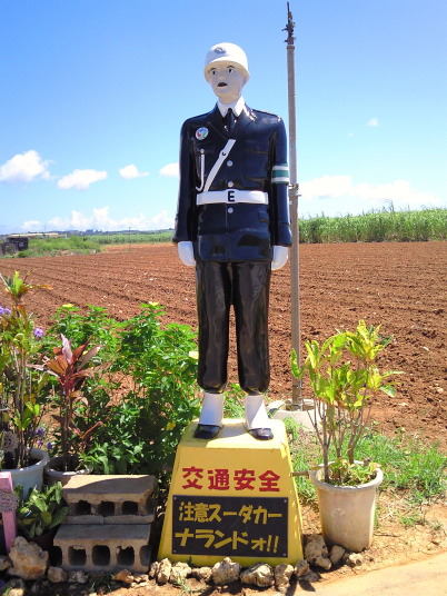 畑の真ん中に「宮古島まもる君」が立っていました。