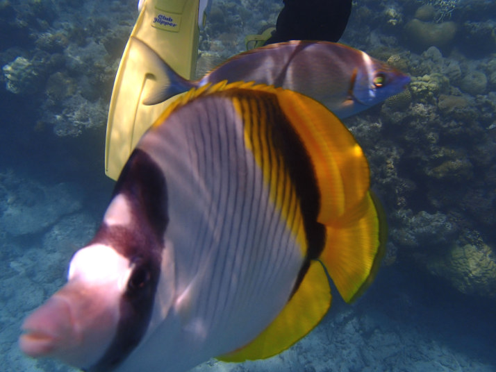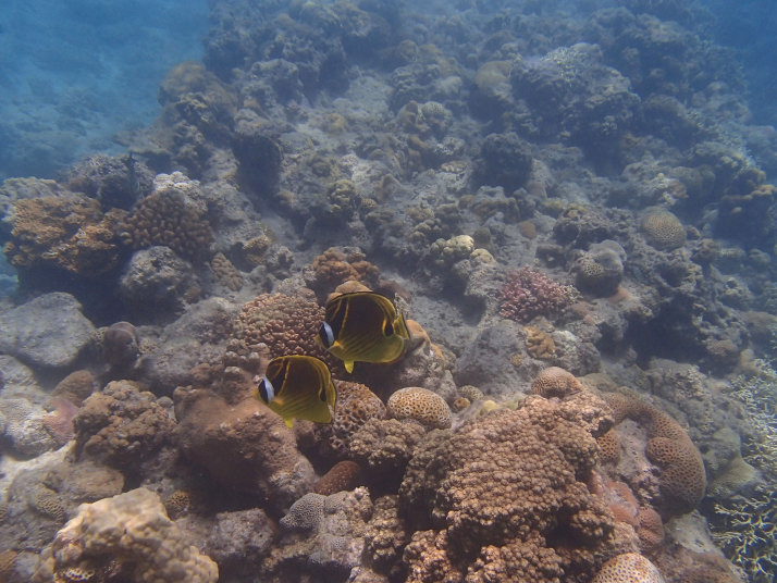 沖の方のダイビング船が泊まっている辺りまで泳ぐと、いつもながらの綺麗な魚達が見えました。