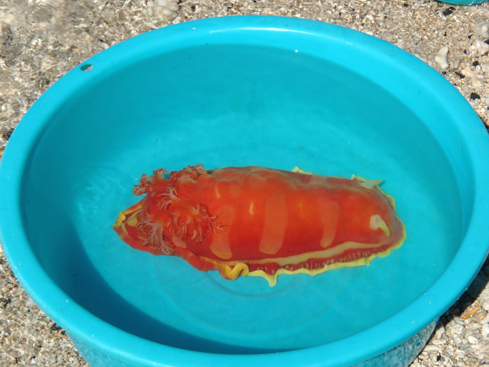 海から上がるとビーチの端の方に人が集まっていたので見に行くと、でっかいウミウシが居ました。