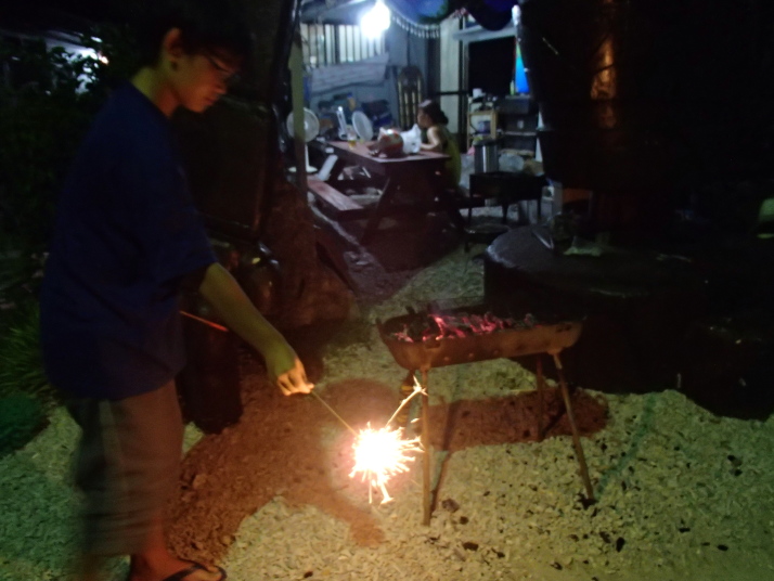 しばらく飲んでいると宿の子供たちが花火を始め、末っ子の「ラオー」が一緒にやろうーと手を引っ張って行くので、一緒に楽しませてもらいました。