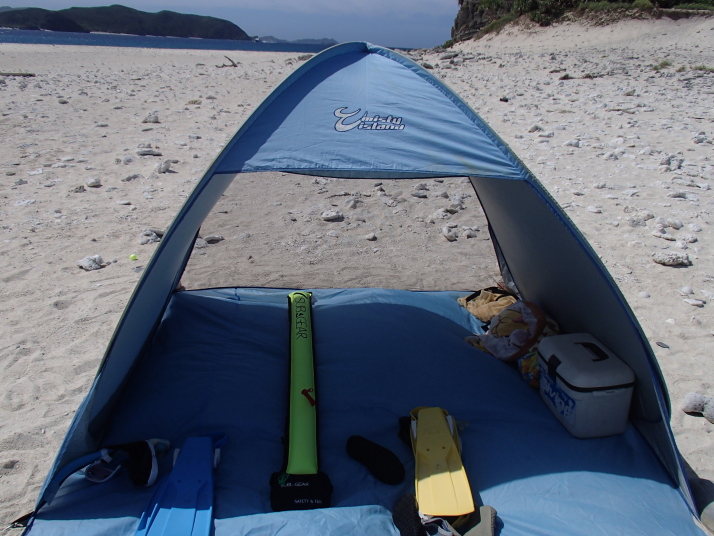 いつもの事なんですけど、テントを設置した後は暑くて暑くて、たまらずすぐに海に飛び込みました。