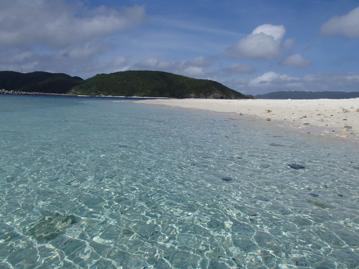 部屋に入ると早々に水着に着替えを済ませ、港へ行きビーチ行きのバスに乗り込むと、運転手のいつものおじさんにも「今回は何拍?」と聞かれ、軽い挨拶を済ませた頃に古座間味ビーチへ到着。