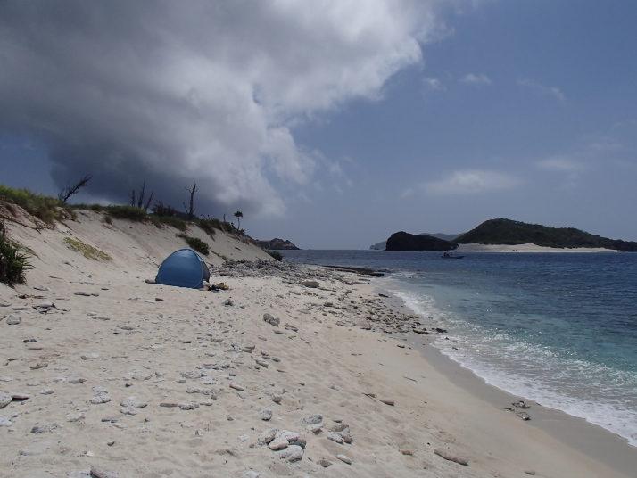 今日の宮平さんの忠告では、昨日テントを建てた場所は風が強い為、後ろが壁になっている辺りが良いとの事で、そっちにテントを設置して見ました。