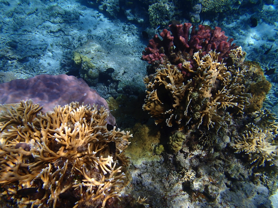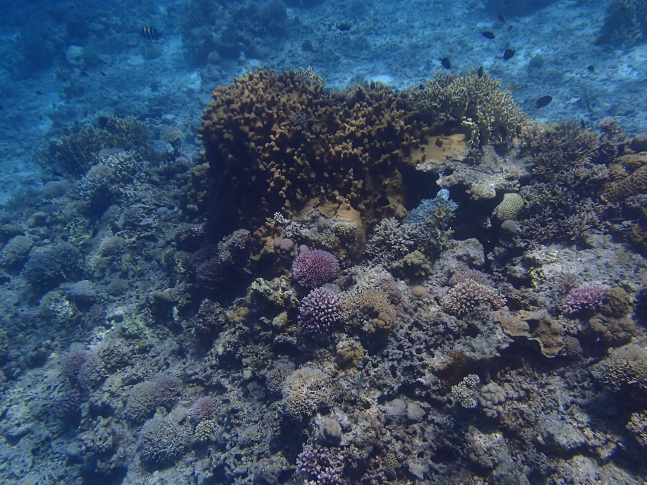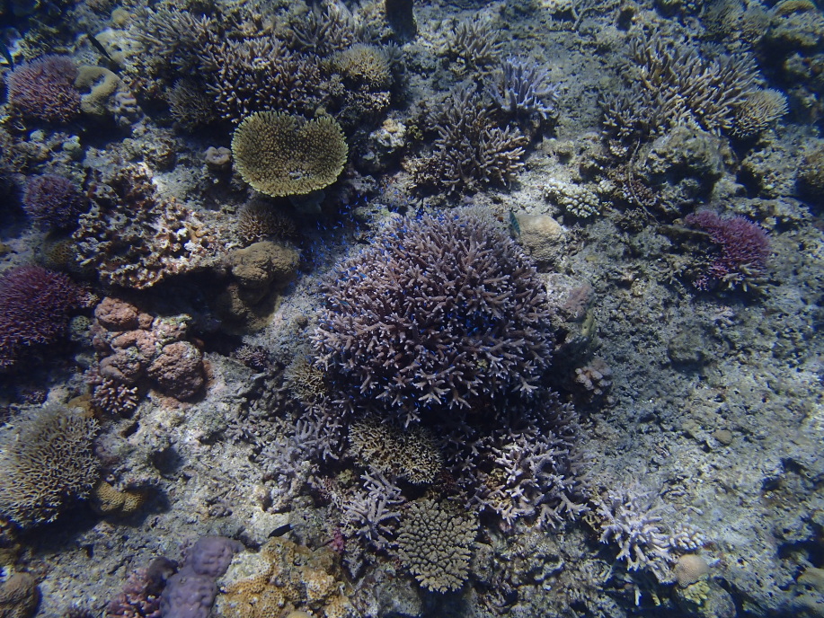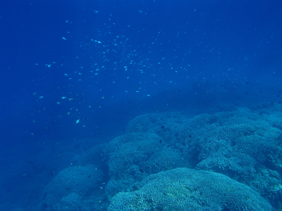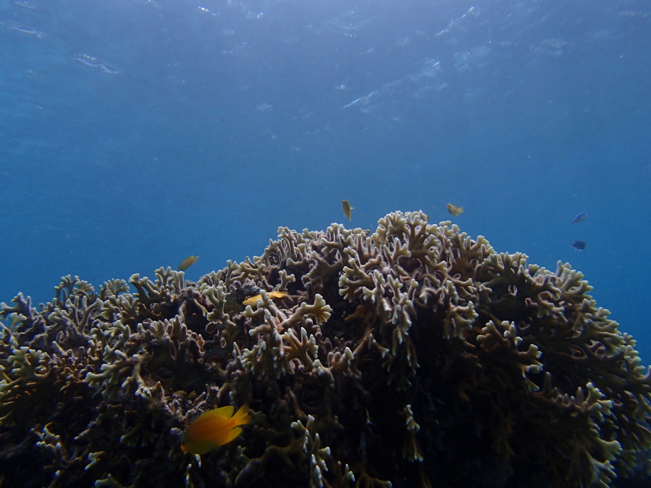 朝一だったので、これでも少し水深は浅かったんですが、結構深い場所に群生している為か、せっかくの珊瑚の色が暗いグリーンにしか見えませんでした。