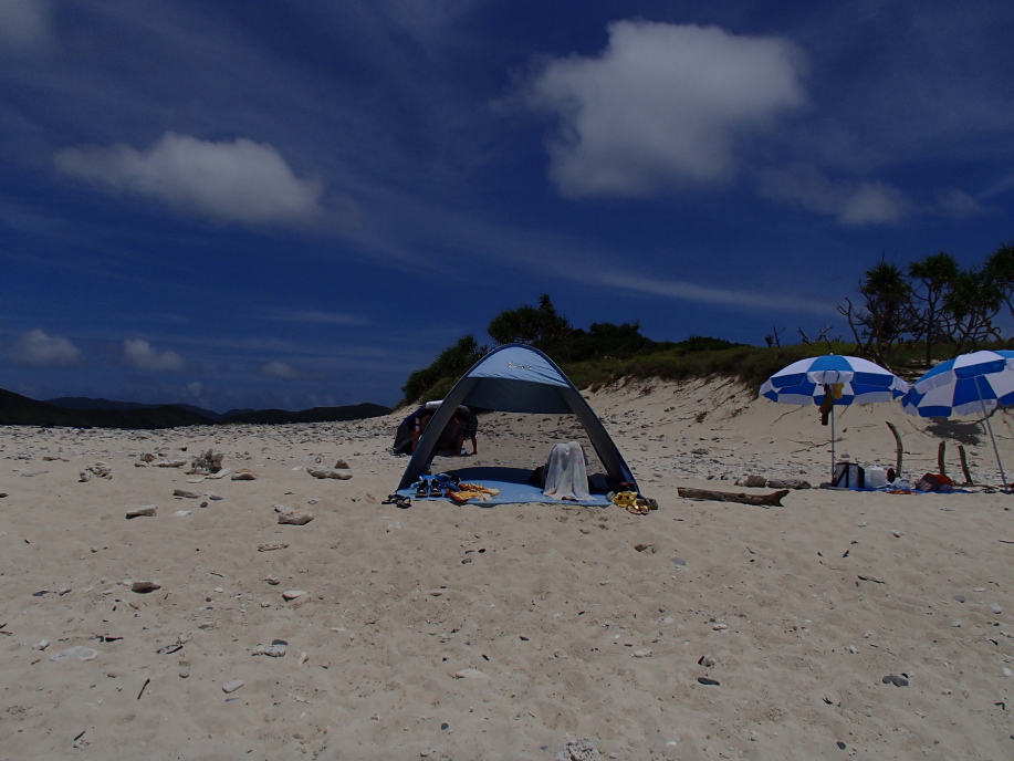 フェリーで来る時にも見かけた外人さん達が、私達のテントの前を歩いてたんですが、、何やら見かけないシュノーケルセットを持ってました。
