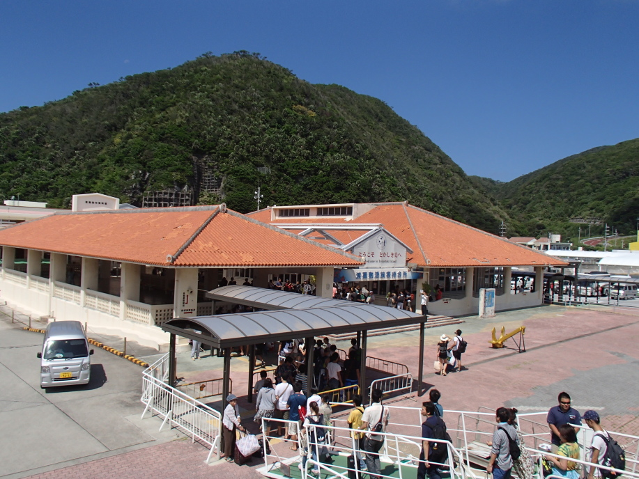 現在、高速船が故障中の為フェリーしか出ていないので、港に到着すると船に乗り込み待ちのお客さん達の列が長蛇になってました。