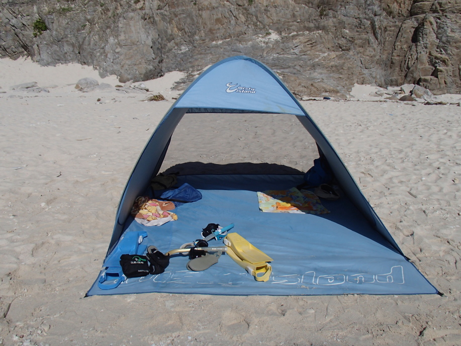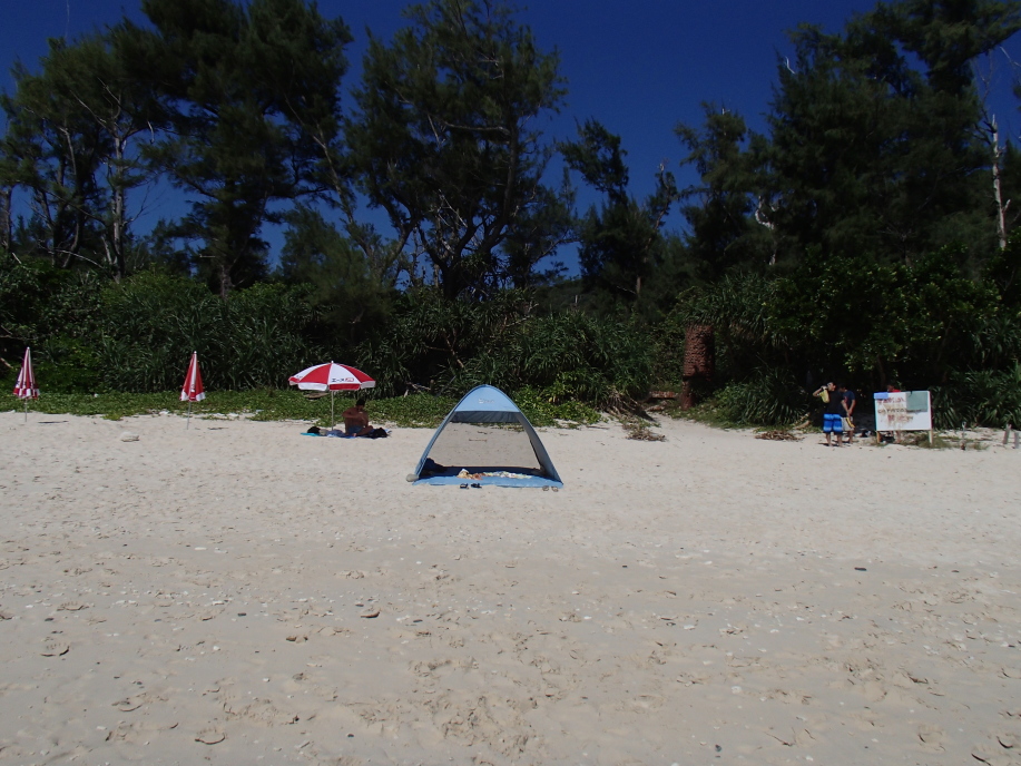 ビーチ左奥の港方面まで歩いてテントを設置しました。
