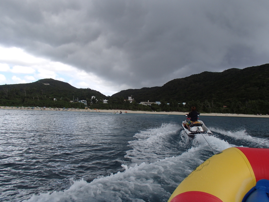 このバナナボートの波を受けて、ひっくり返るんじゃないかと見てたんですが、大丈夫そうでした。