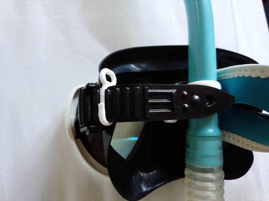 マスクを装着して、留めるゴムを強く引っ張った時、何やら私のマスク近辺から黒いプラスチック製品が飛んで行くのが見え、とっさに水中に手を突っ込み、その黒いプラスチックをつかみました。