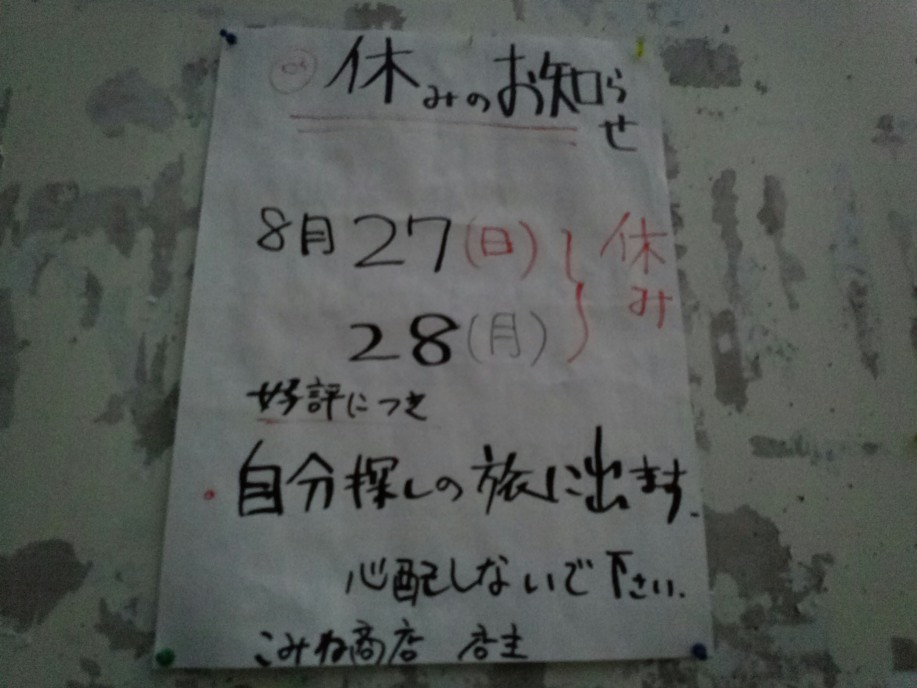 港で夕涼みをするのに「こみね商店.」で飲み物を買いに立ち寄って見ると、この張り紙が貼ってありました。