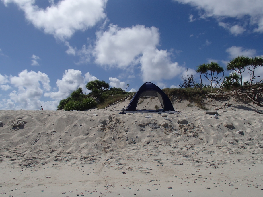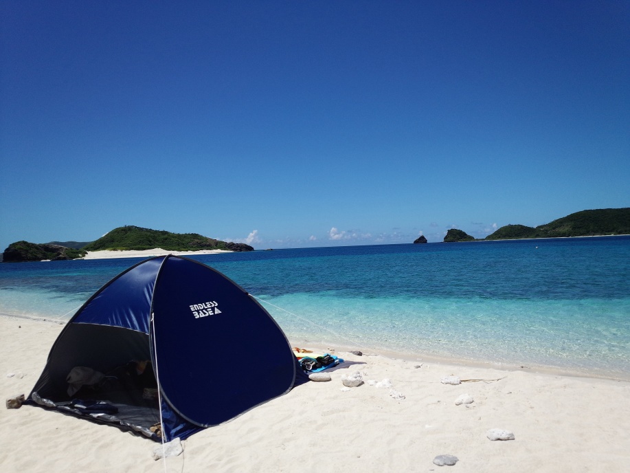 朝早かったので、他のお客さんはまだ1組しか上陸していなかったので、絶好の場所にテントを設置できました。