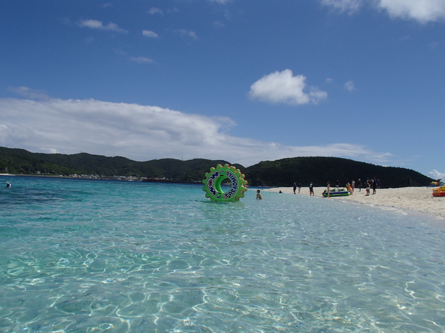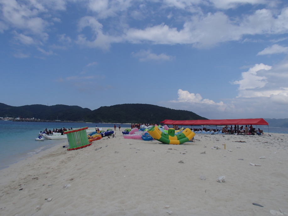 島に着くと、浮き輪が大量に置いてあり、米軍の祭りにあるような水中遊具もあって、確かに異様な光景では有りました。