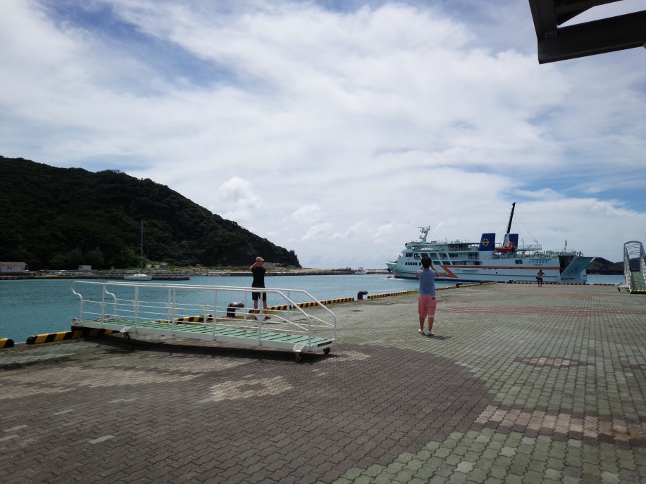 今日は朝一の高速船と12時着−12時30分出発の折り返しのフェリーのみ運行だったので、座れるか心配で11時には港へ行って、荷物を置いて順番を確保しておきました。