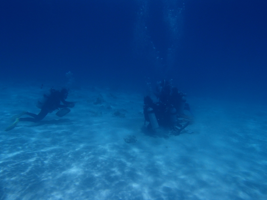 珊瑚の横辺りで、ダイビングツアーのお客さん達が記念撮影をやってました。