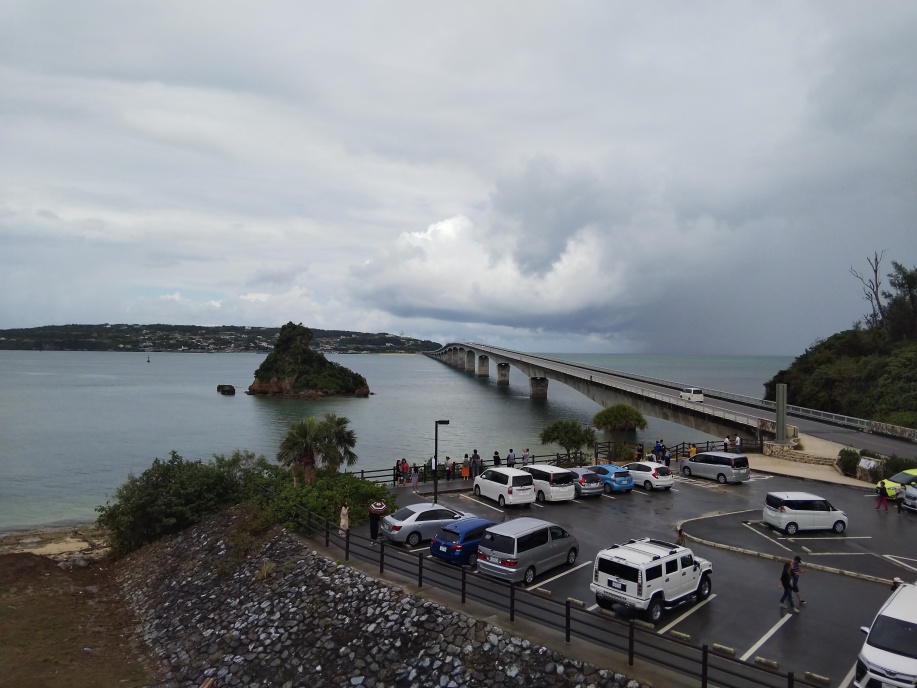 やっぱり どうしても綺麗な海を見てもらいたいので、「伊計島」の橋の上から海を見に行ったんですが、実はここも私達が着いた とたんに曇って来ました。