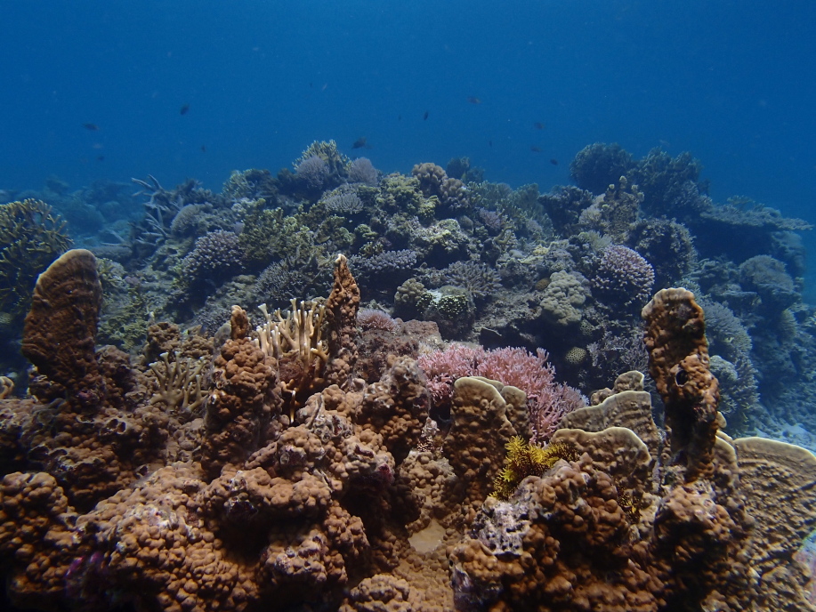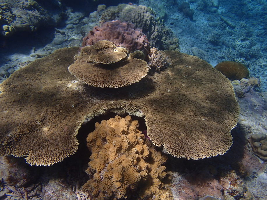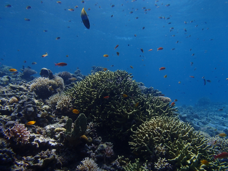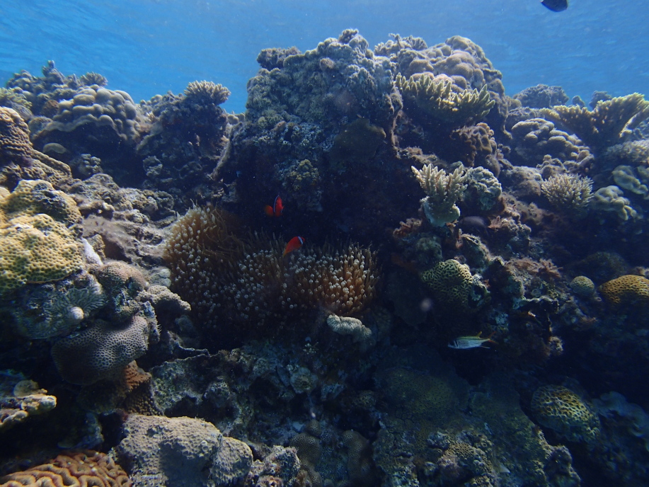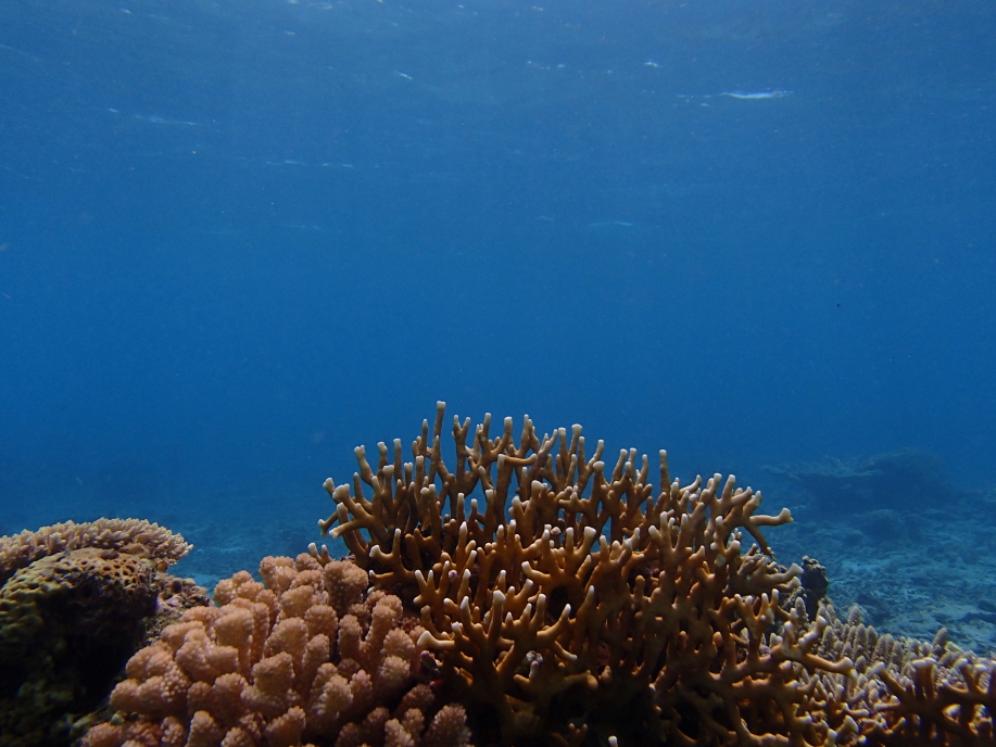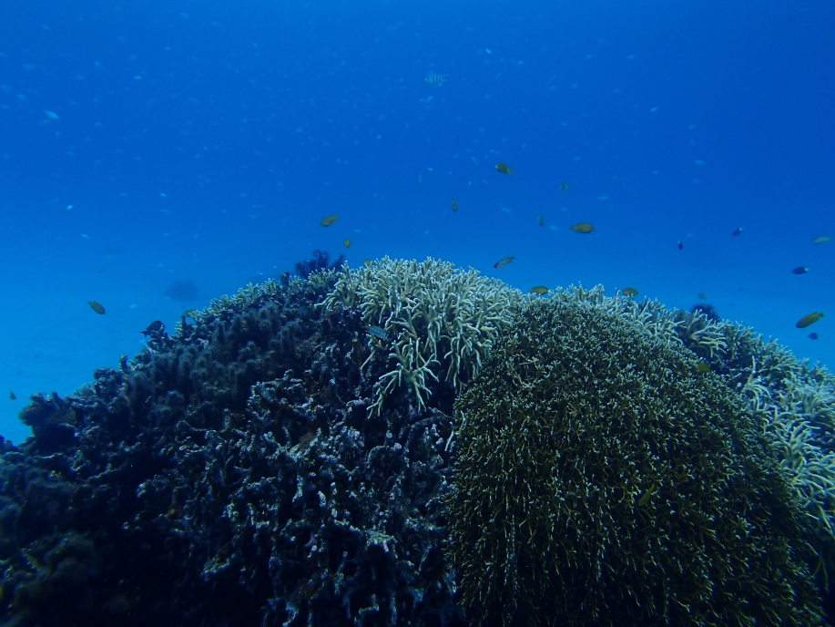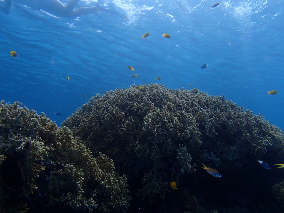暑くて海に飛び込むと、意外と綺麗に珊瑚が見れました。