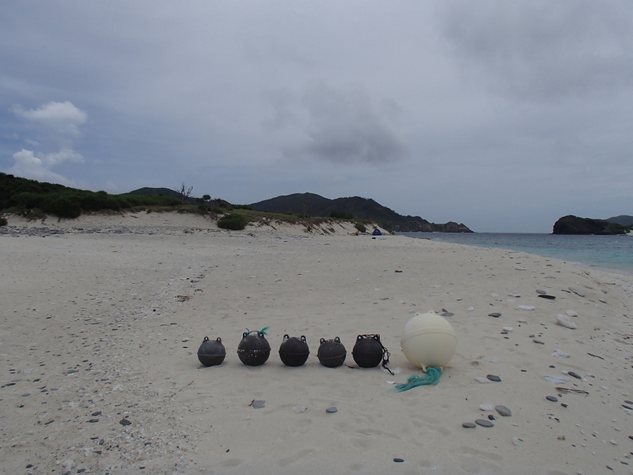 ビーチに戻って来て散策していると、うちの奥さんが黒いブイを見て拾いだし、並べようと言うので並べて見ました。