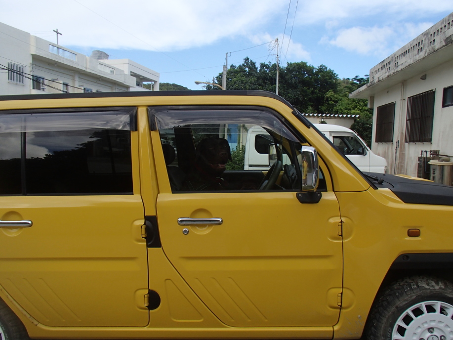 宿のすぐ隣の店の前に留めてある、車の運転席に犬が座ってこちらを見てました。