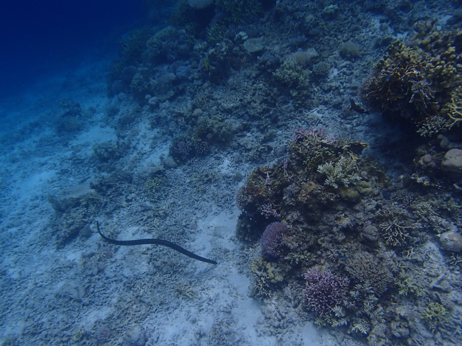 いつも見る縞模様のウミヘビでは無かったんですが、サイズがデカくて怖かったー!