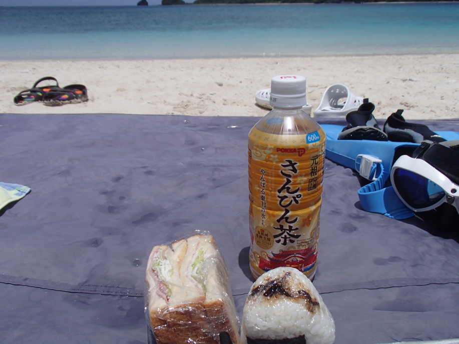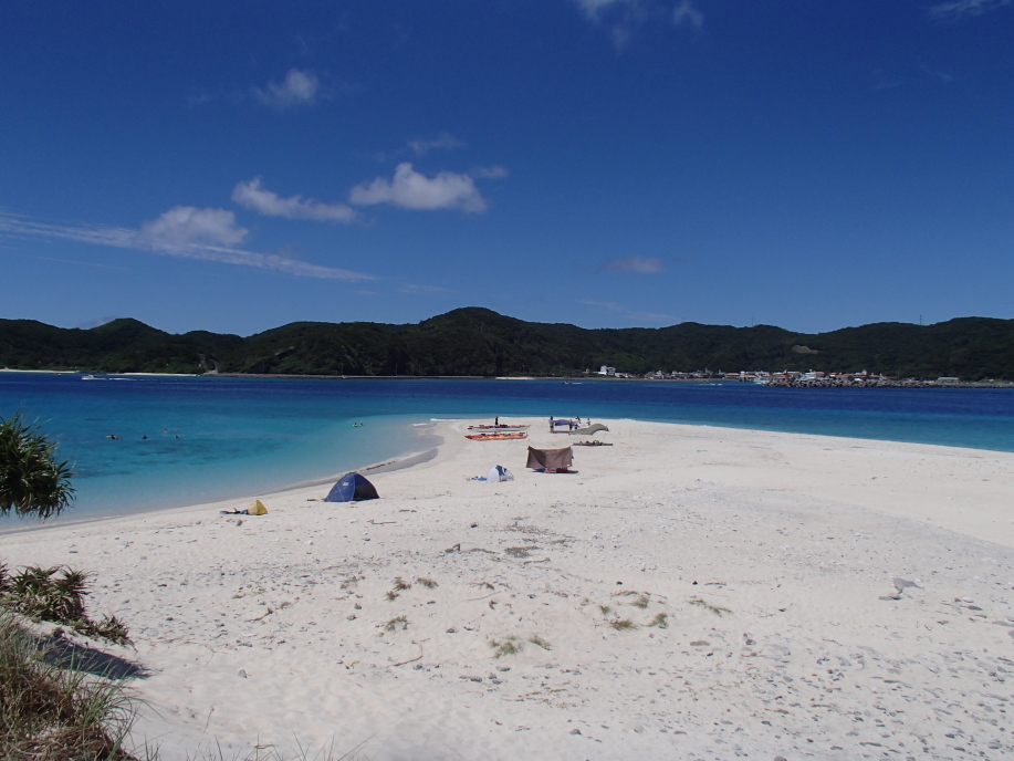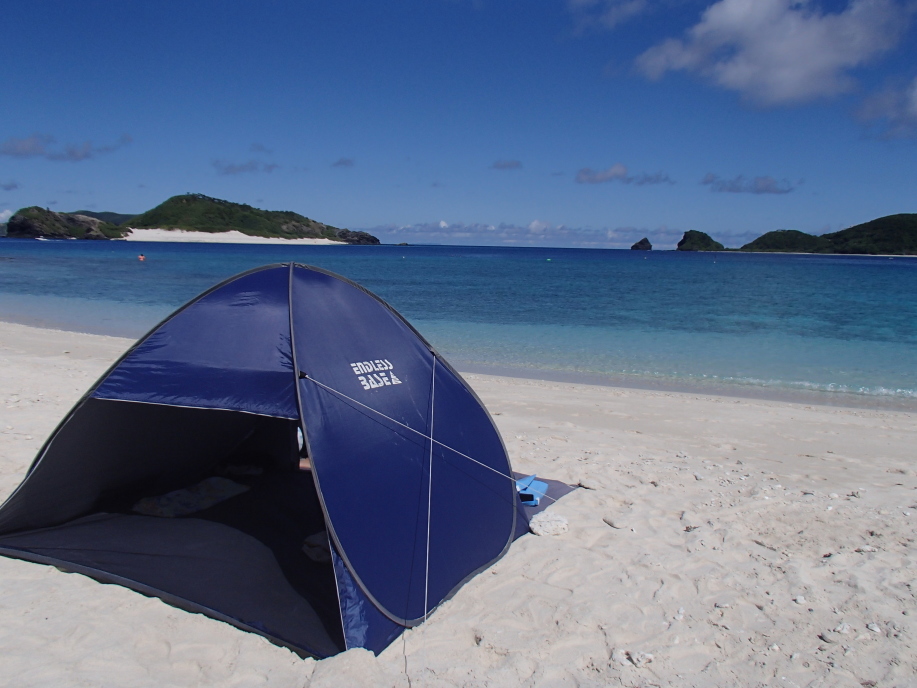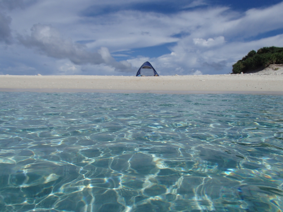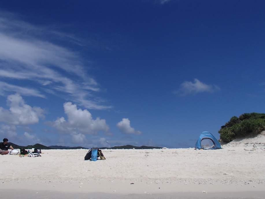 安慶名敷島へ上陸すると、今日も まずまずの天候で、昨日と同じ場所にテントを設置しました。