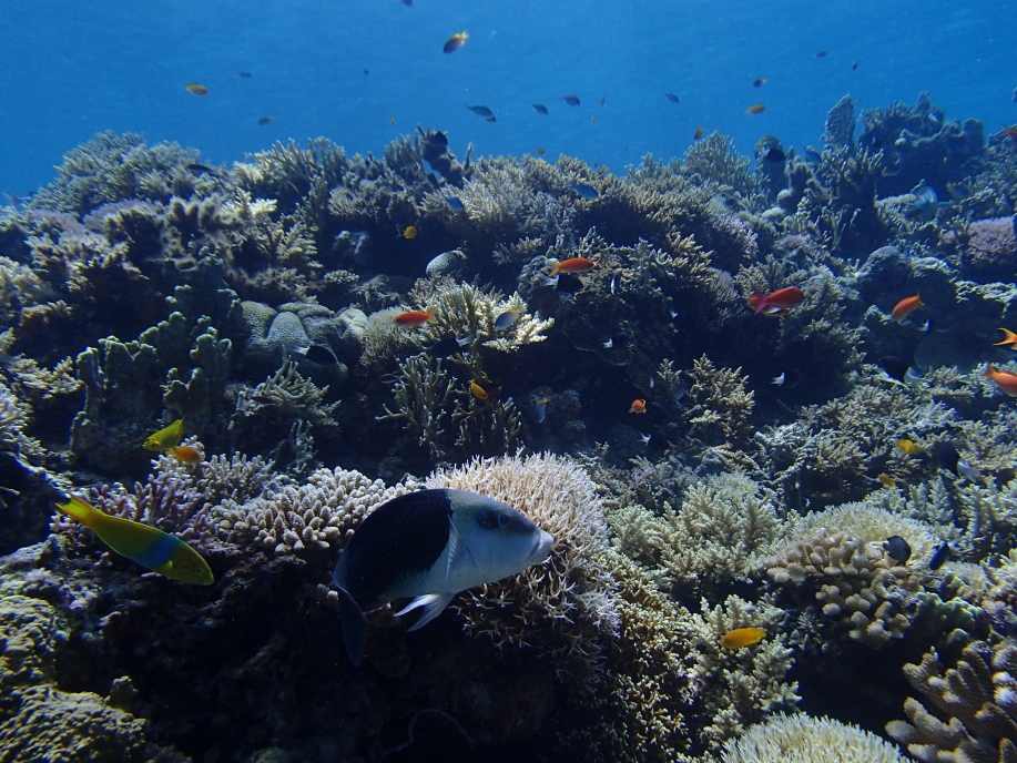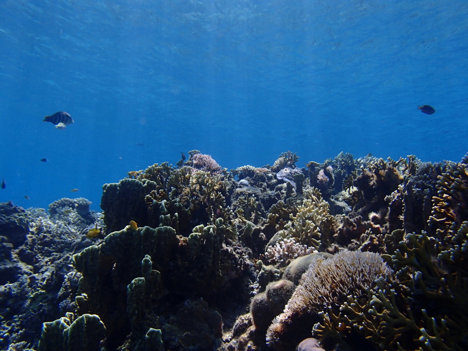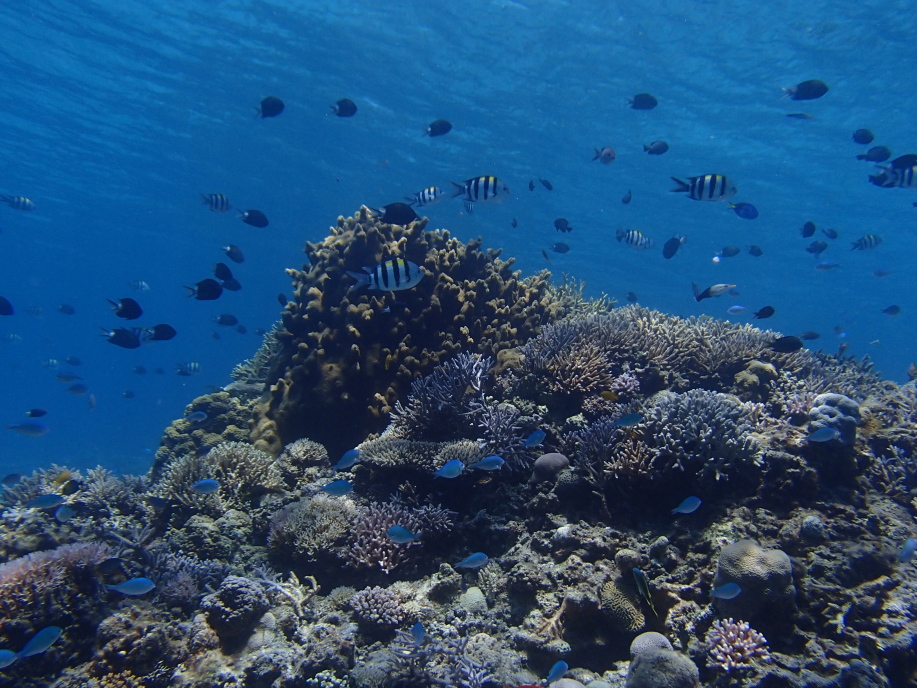また潜って下の方から写真を撮ると、珊瑚に群がる魚達が一杯いて綺麗でした。