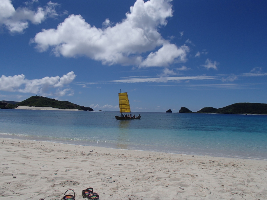 サバニを漕いで来たお客さんと島の若者達は、シュノーケルでしばらく泳いで珊瑚を見た後、またサバニを漕いで帰るようで、泳ぎ出す前に「帰りの体力も残しといてよー!」とか言ってました。