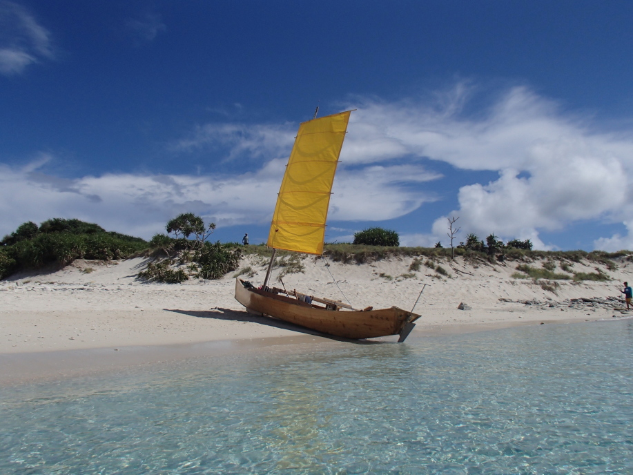 テントから沖の方を眺めていたら、サバニらしき船がこちらに向かってきて島に上陸しました。