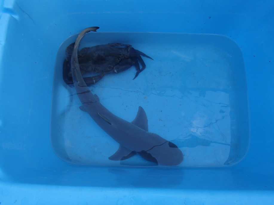 宿に戻ると、多分お父さんが捕まえて来た、カニと鮫が水槽に入ってました。