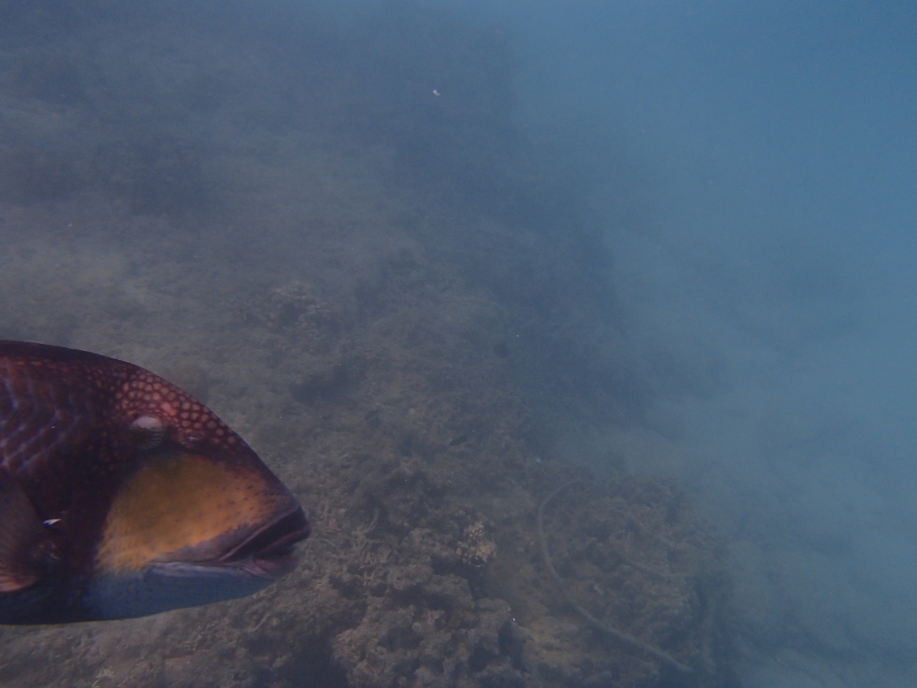 めちゃくちゃ濁りが強かったんですが、子供達が泳いでいる方へ探しに行って見ると、巨大なゴマモンガラがグルグルと周りを泳いでました。