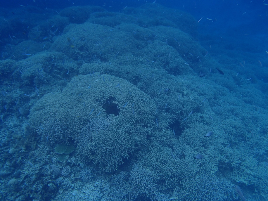 沖の緑色の珊瑚の群生辺りまで行くと、「GoPro」を持った娘達が潜ってました。