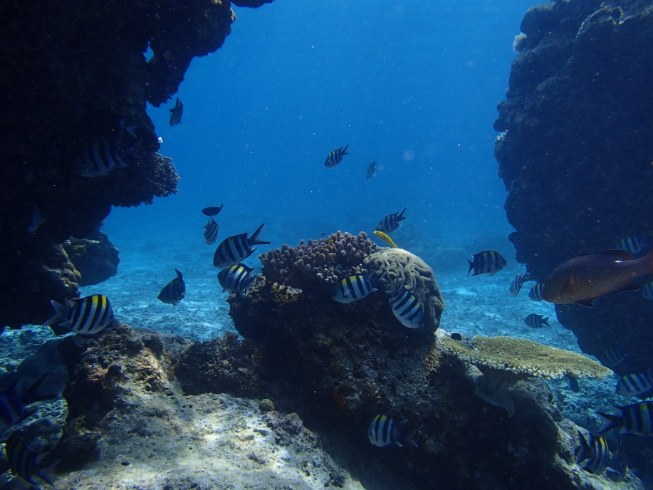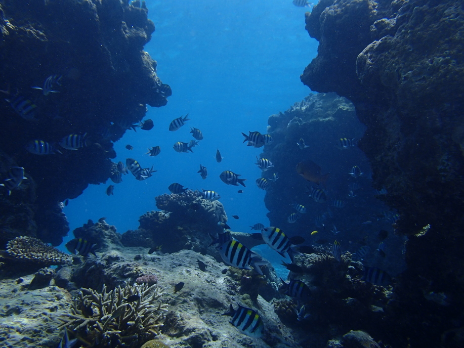 今回は島の周りを左方面へ、行ける所まで行って見ようと泳いで行くと、大きな岩が2つに割れていて、そこに珊瑚の群生や魚達が群がっていました。