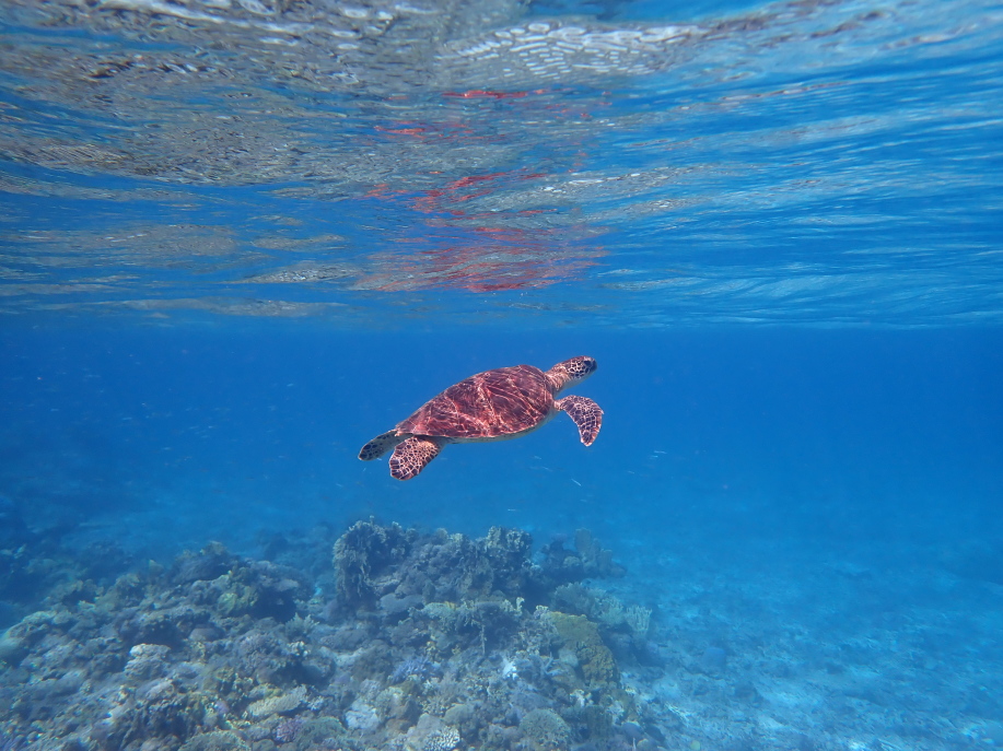なので最初の1本目の泳ぎを楽しもうと、すぐに海へ飛び込むと、この島で初めてウミガメが居るのを見れました。