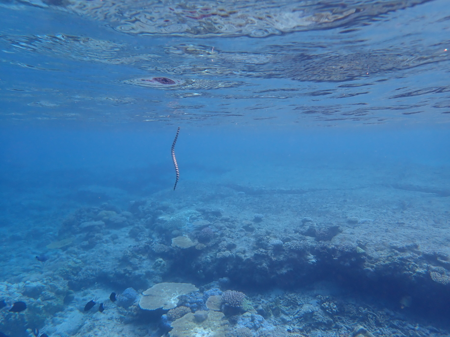 泳いでいると、途中でウミヘビと遭遇し、思わず写真を撮りました。