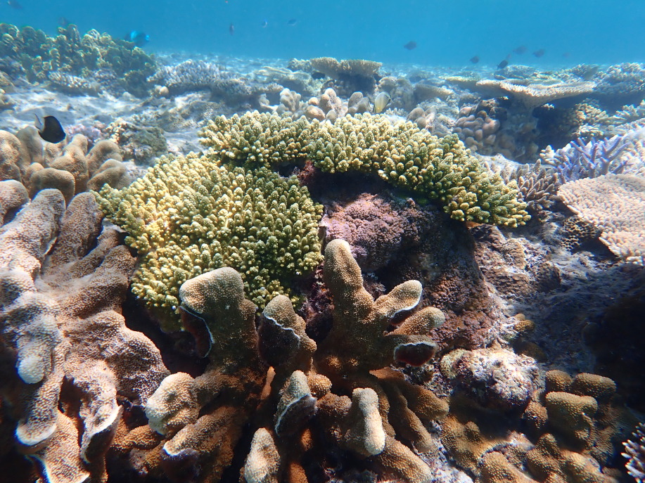 その後、沖の緑色の珊瑚の群生まで泳ぎ、潜って写真を撮りました。
