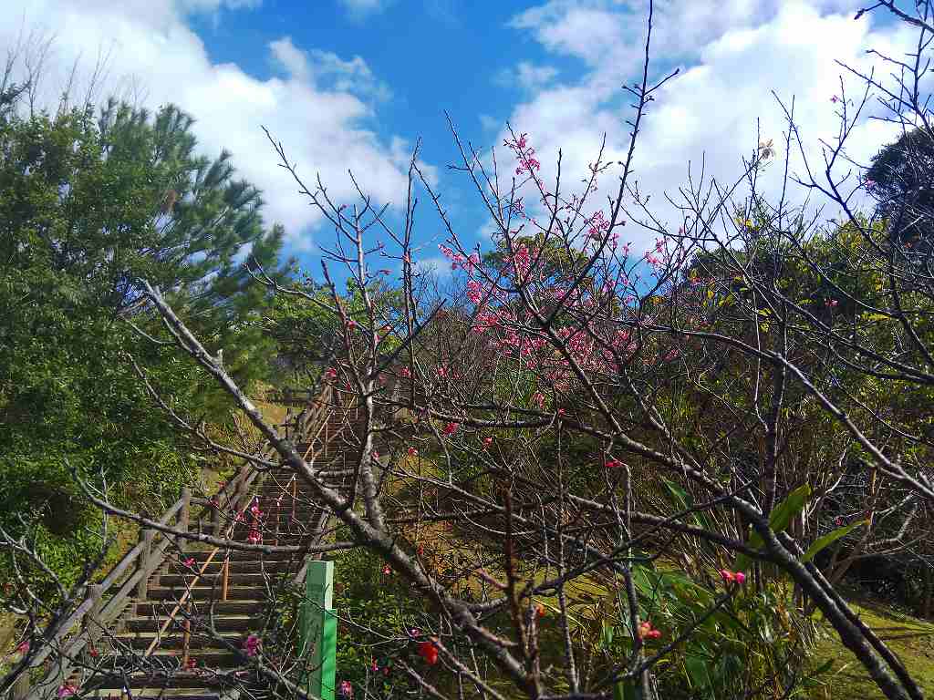 食後すぐに「展望台行き」のバス乗り場まで戻って、12時半頃発のバスに乗車し「名護城公園天上展望台」に到着しました。