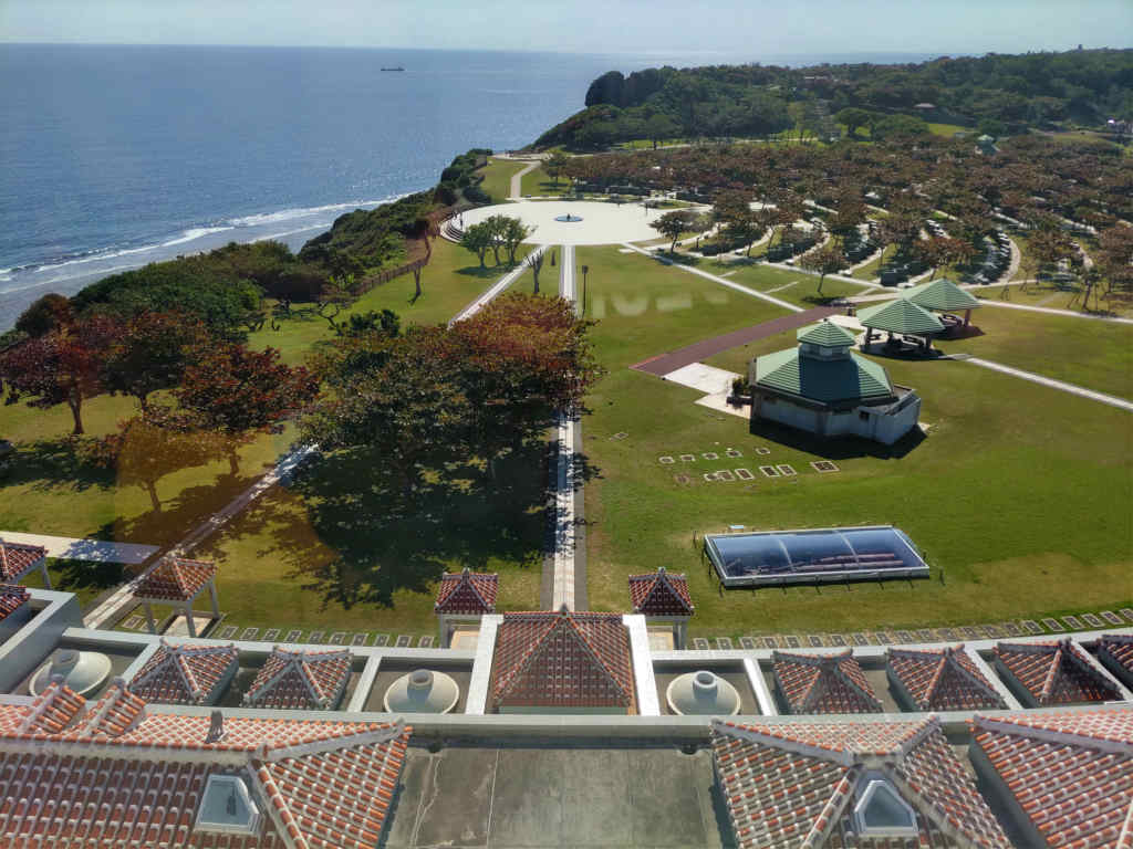 館内のエレベーターで屋上展望台まで登り、上から「平和祈念公園」を一望する写真を撮ってみました。